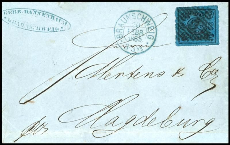 2 Silbergroschen blau, bogenförmig durchstochen 16, farbfrisches und tadellos durchstochenes Luxusstück als Einzelfrankatur auf Brief (rs. fehlt ein Seitenteil) nach Magdeburg, nebengesetzt Orts K2 "Braunschweig 20 Febr 1865", Marke entwertet mit Nummernstempel große "9", ein schöner und zugleich se