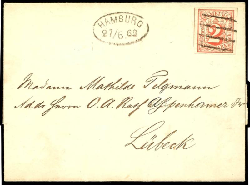 2 Schilling orangerot, vollrandiges und farbfrisches Kabinettstück, Einzelfrankatur auf Brief von "Hamburg 27 6" nach Lübeck, Name der Adresse etwas überschrieben, links zeigt die Marke die volle Zwischenlinie, sie ist entwertet mit voll abgeschlagenem Vierstrichstempel, Fotoattest Lange BPP, Mi. 90