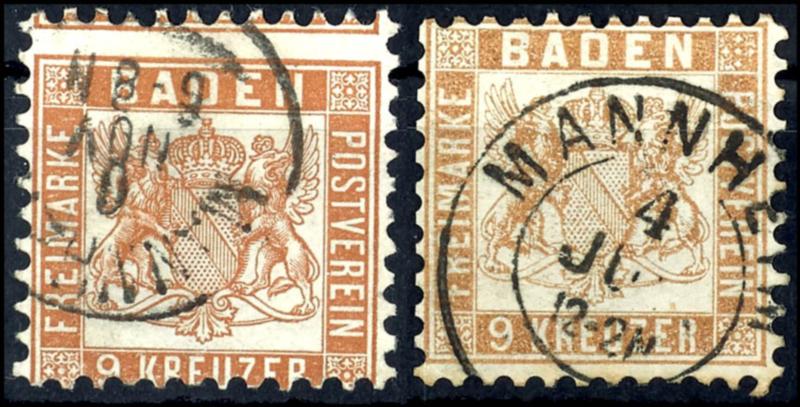 9 Kreuzer Wappen, hellbraun und gelbbraun, je farbfrisches Kabinettstück, je gestempelt "MANNHEIM", gepr. Stegmüller BPP, Mi. 140.-9 kreuzer coat of arms, pale brown and yellow brown, always having bright colours extremely fine copy, always used \"MANNHEIM\", expertized Stegmüller BPP, Michel 140