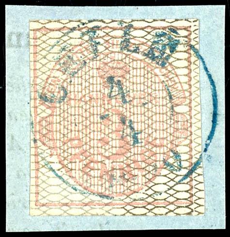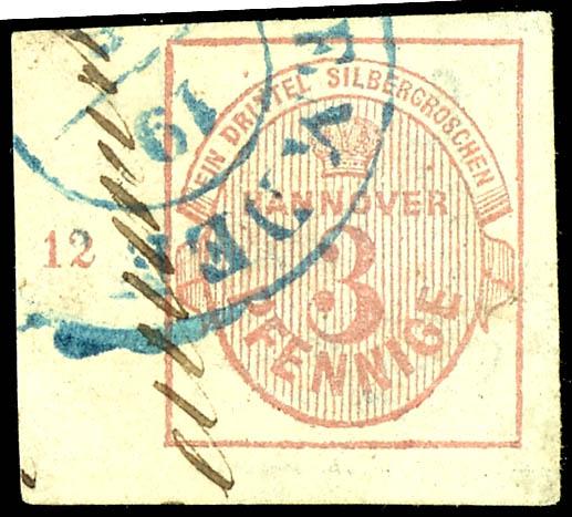 3 Pfennige lebhaftrötlichkarmin auf grau, vollrandiges und farbfrisches Kabinettstück, entwertet mit zentrisch abgeschlagenen blauem K2 "Celle 4/4" auf Briefstück, Fotobefund Berger BPP: "echt und einwandfrei", Mi. 450.-, ex Sammlung Höffen3 pennies bright red carmine on grey, having full margins