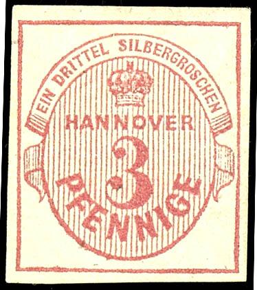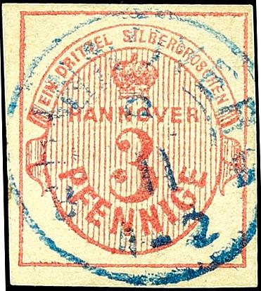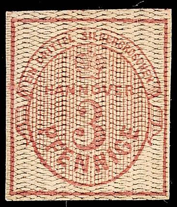 3 Pfg karminrot, farbfrisches, allseits voll/breitrandiges Kabinettstück mit zentrischem blauen K2 "HANNOVER", Fotobefund Berger BPP "einwandfrei", Mi. 200.-3 Pfg carmine red, having bright colours, on all sides full / with enormous margins extremely fine copy with blue S.O.N. Two ring cancel \"H