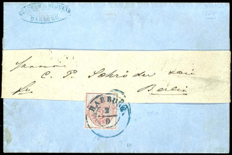 3 Pfennige grau genetzt auf vollständiger Postvereins-Drucksache HARBURG 2/9 (1857) mit komplettem Inhalt nach Berlin in ursprünglicher, bildschöner Erhaltung3 pennies grey net like pattern on complete Postal Union printed matter HARBURG 2 / 9 (1857) with complete content to Berlin in originally,