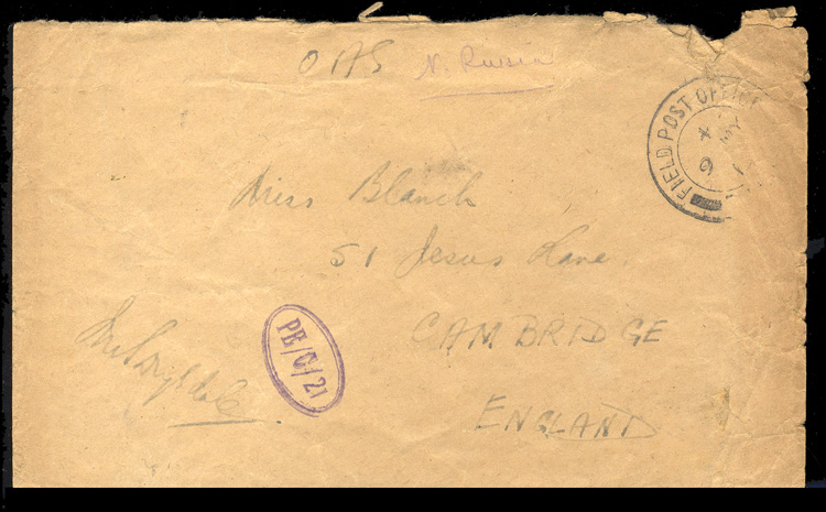 1918 (9 May) free frank cover to England, Field Post Office and "0175" endorsement, oval "PE/C/21" censor strike, some wear and tear, otherwise fine