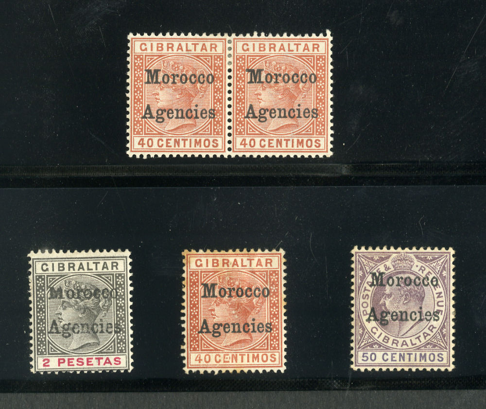 1898-1905 selection of unused varieties with 1898 2p black & carmine with "V for A" variety, horizontal pair of 1899 40c orange brown with variety "Broad top to M", single with damaged "E" in "CENTIMOS", 1903-05 50c purple & violet with variety "CD sideways", one with minor toning, otherwise fine (S
