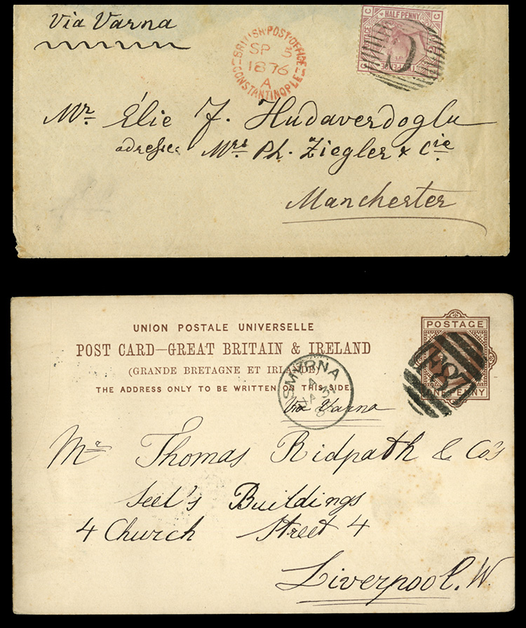 1876 cover franked with 2 1/2p Victoria, tied by "C" in bars, endorsed "Via Varna", with red "British Post Office Constantinople" departure pmk alongside, sent to Manchester, backflap missing, with arrival pmk. Also included is a 1p stationery card, canceled "F 87", with corresponding Smyrna at lef