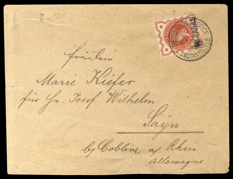 (SG 7) 1893 40pa handstamped surcharge (type 1, with broken "S") on Great Britain 1/2d vermilion, cancelled by B.P.O. Constantinople 27.2.93 cds on cover addressed to Germany, with additional Constantinople cds and Sayn (3.3.93) arrival pmks, fine and scarce usage, with 2011 BPA certificate. This p