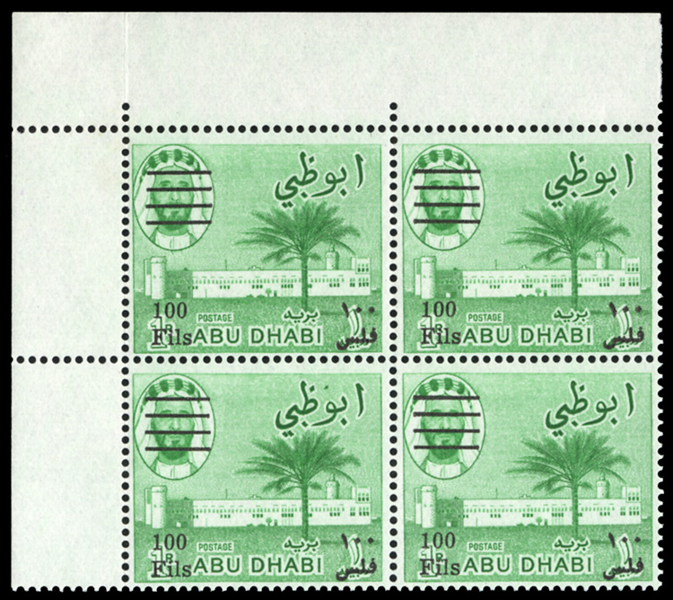 (17-27) 1966 New Currency surcharges, complete set of eleven in corner blocks of four, some marginal flaws, stamps n.h., v.f., scarce set of blocks (SG 15-27,£1,200) $1,090
