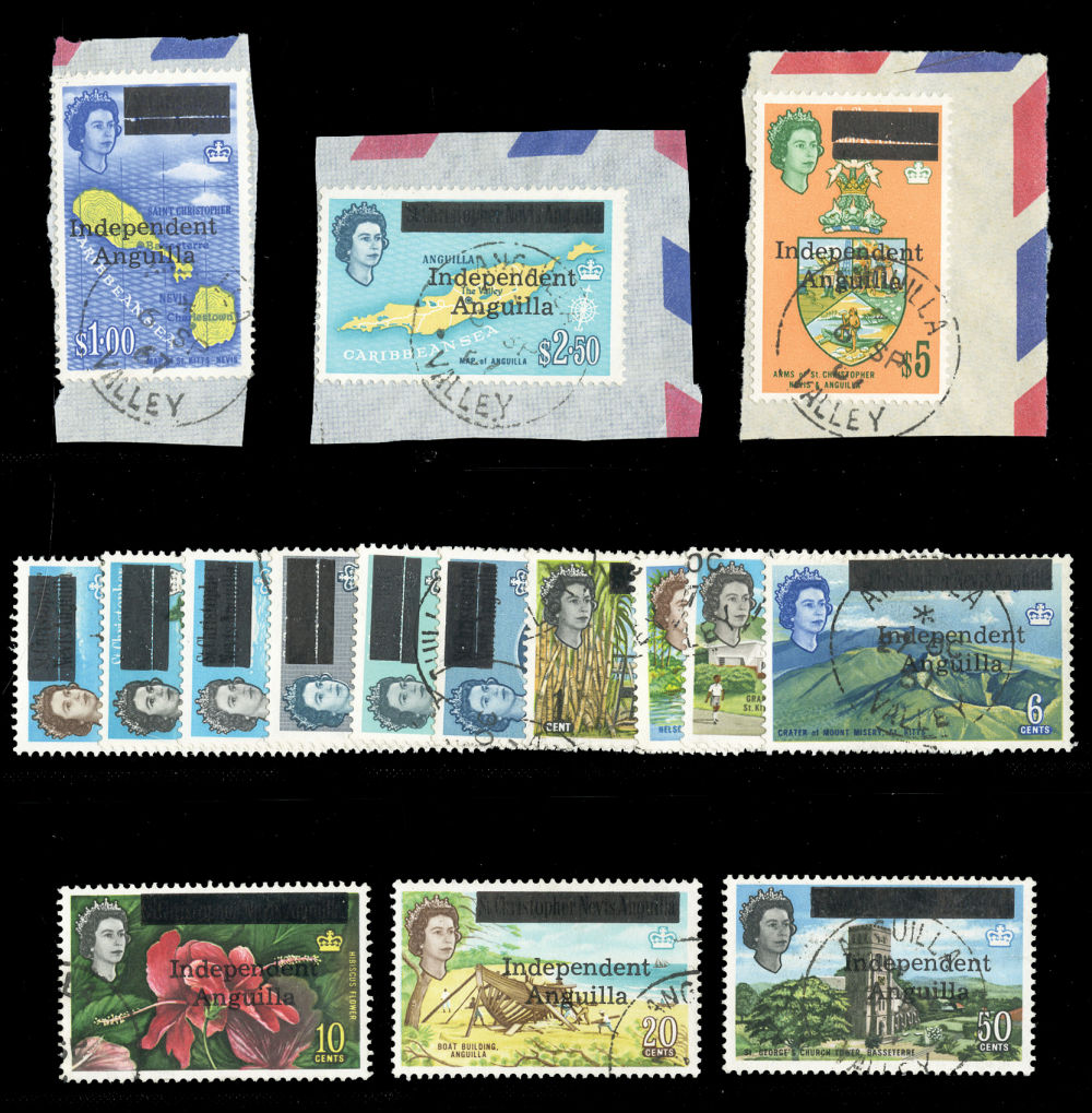 1967 Independent Anguilla overprints, 1/2c-$5 complete set of 16, used, last three canceled on pieces, each with "Anguilla Valley" cds, fine-v.f., quite scarce (SG £4,250) $4,160