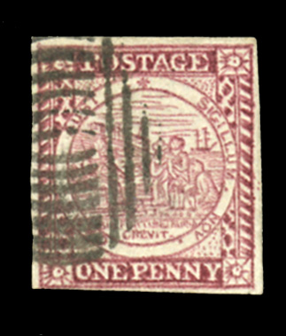(2n) 1850 1p crimson lake, bluish wove paper, used, margins all around, close but clear at bottom left, fine stamp, $750