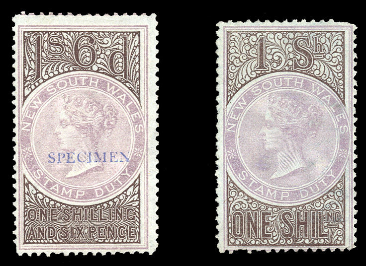 1864 1sh violet & red brown, watermarked and perforated printer's proof without gum, small faults, also 1sh6p overprinted "Specimen" in blue, with gum, fine