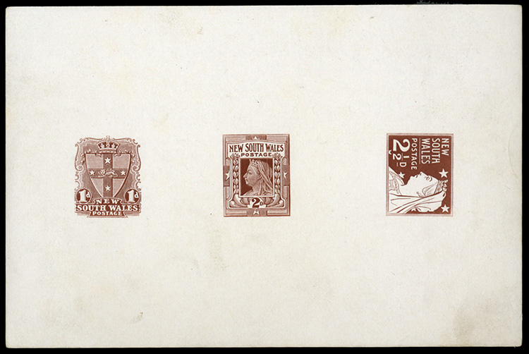 1897 Diamond Jubilee 1d, 2d and 2 1/2d, composite triptych die proof in red-brown on thin glazed card (143x94mm). An attractive and unusual item with the 2 1/2 die placed sideways