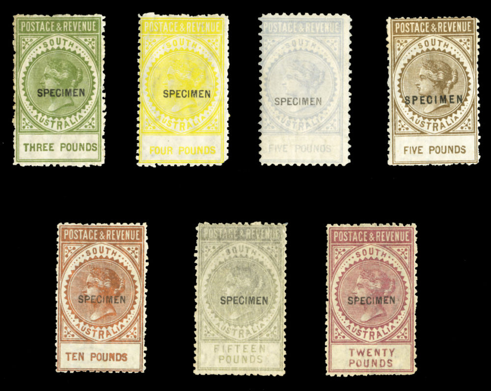 (88a-93aS) 1886-96 Postage and Revenue £3-£20 group of seven different overprinted Specimen, with £3 sage-green, £4 lemon, £5 gray, £5 brown, £10 bronze, £15 silver and £20 claret, h.r., fine-v.f. (SG 203s-208s)