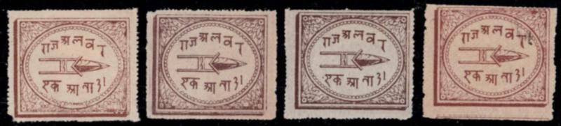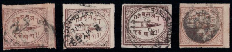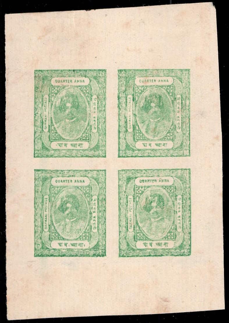 1877-1901 ¼ anna blue rouletted (used & mint), 1 anna brown (used & mint), 1899 - ¼ anna green wide-margins (used & mint) and ¼ anna green/yellow-green (narrow margin) used and mint stamps US$0