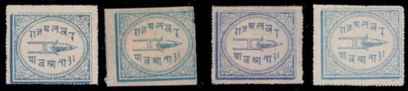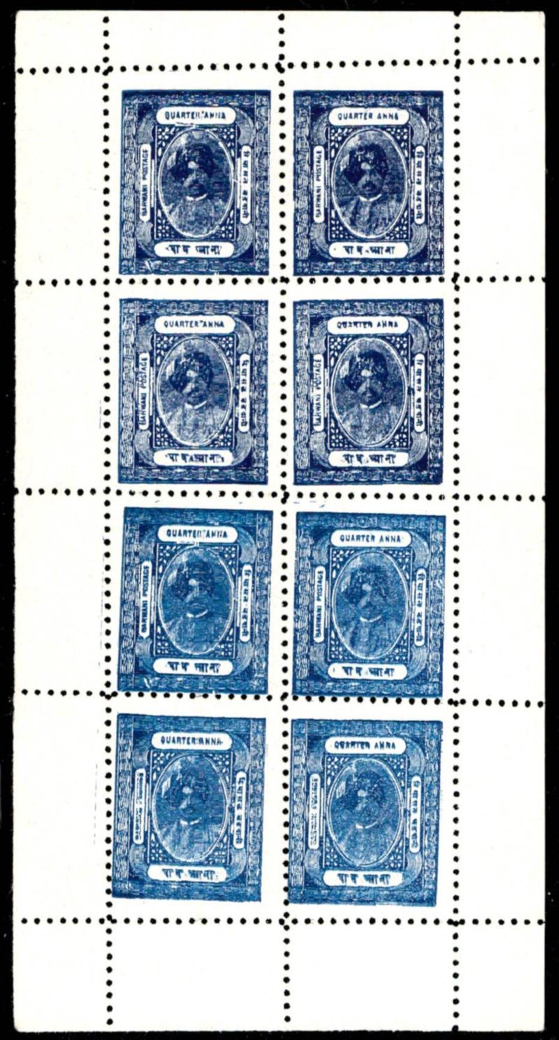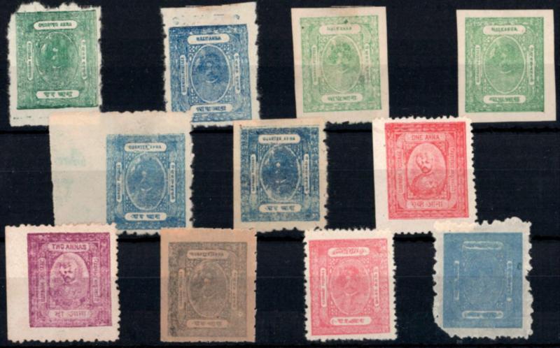 Group of mint stamps - 1921 ¼ anna green and ½ anna ultramarine on soft wove paper, ½ anna green on laid batonne paper, 1922- ¼ anna deep-grey blue and steel-blue, 1 anna vermillion and 2 anna purple, ¼ anna grey-blue, 1923 ¼ anna rose, 1925 ¼ anna milky-blue on laid paper. Unused without gum as iss