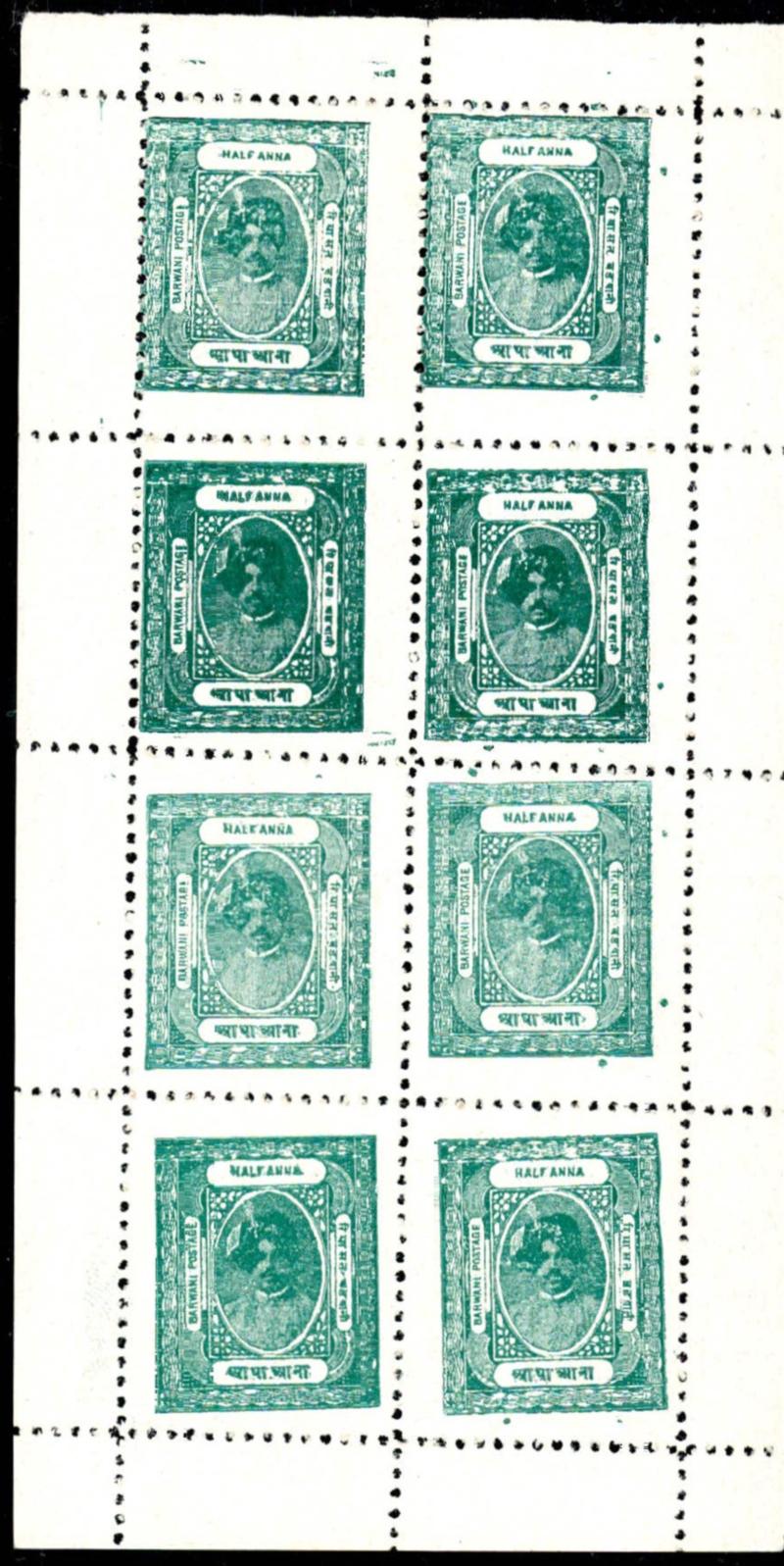 1929-32 ½a complete sheet of 8, top four stamps printed in myrtle-green and the bottom four stamps printed in turquoise-green. A spectacular item. Unused without gum as issued. 2025 ISES certificate US$0