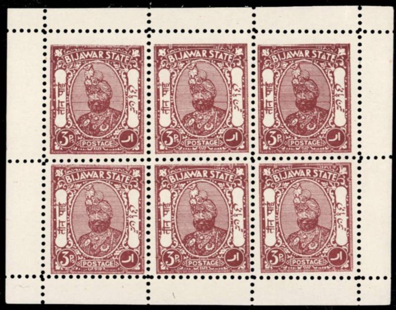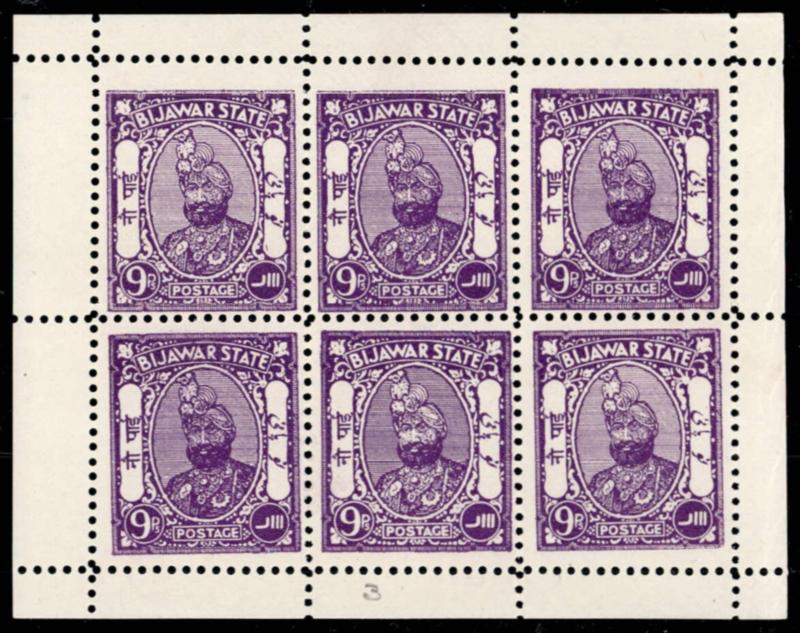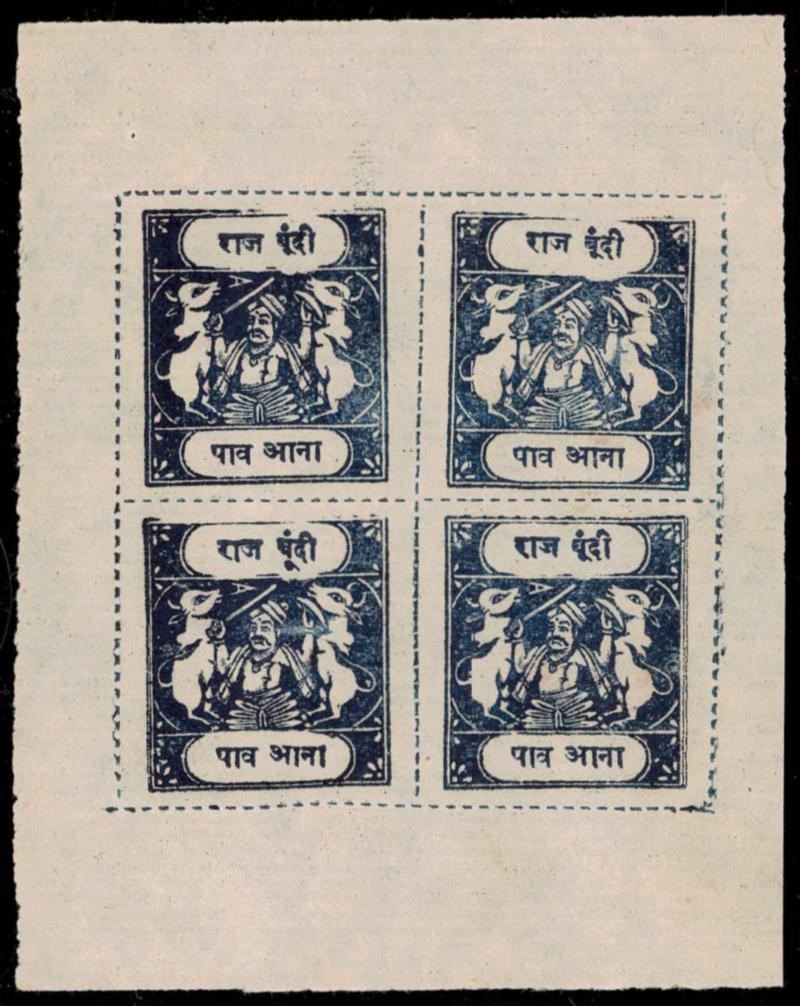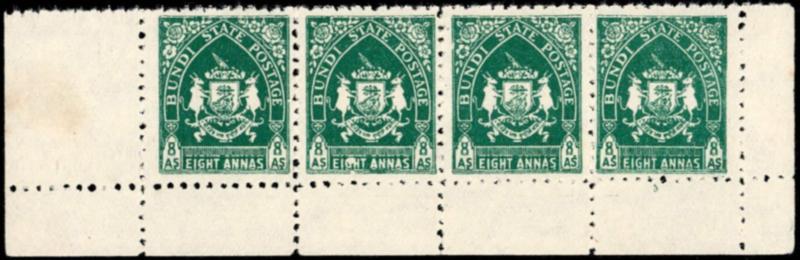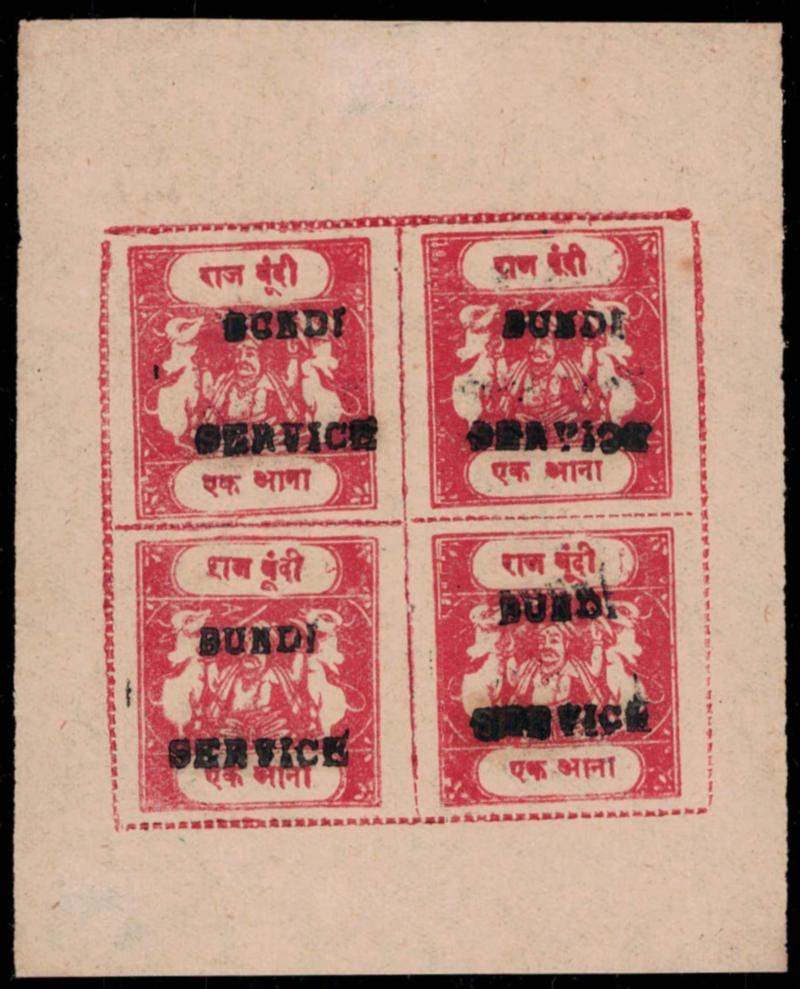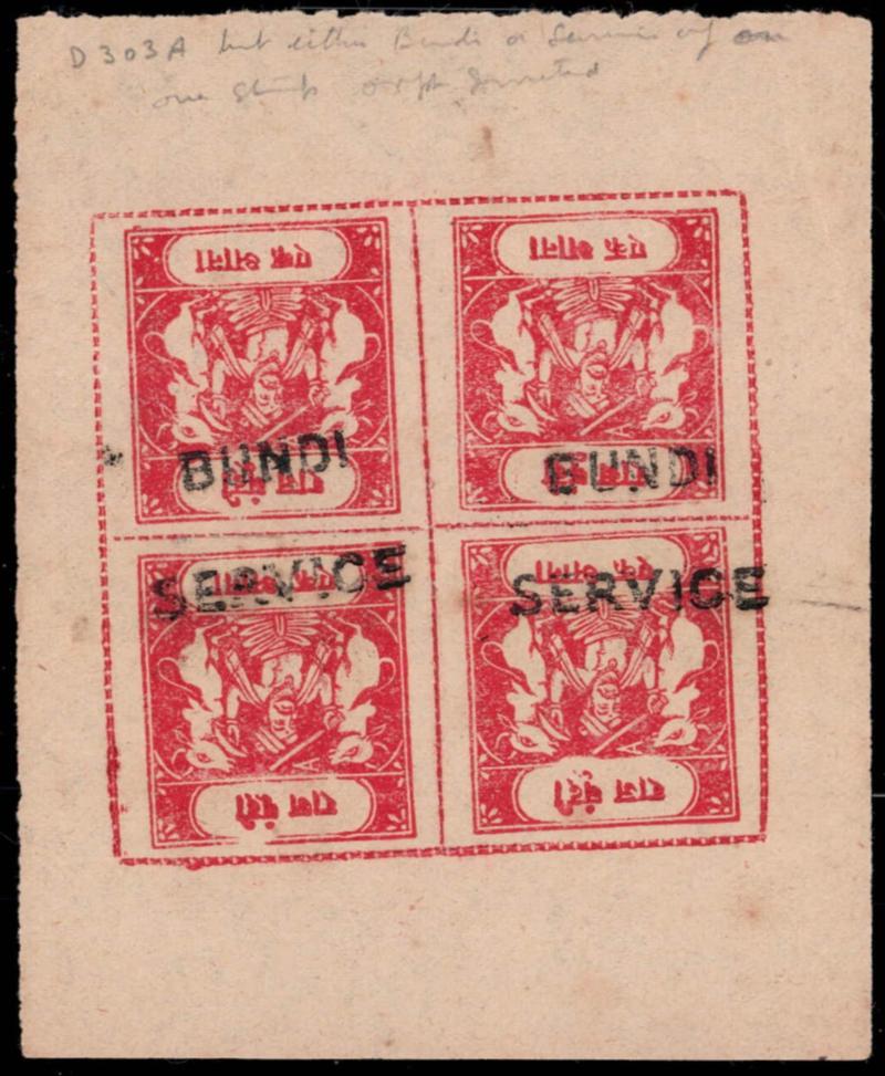 1915-41 3a chestnut complete sheet of four overprinted Bundi Service in Devanagri sideways. Stamps cancelled to order and very scarce as such. US$0