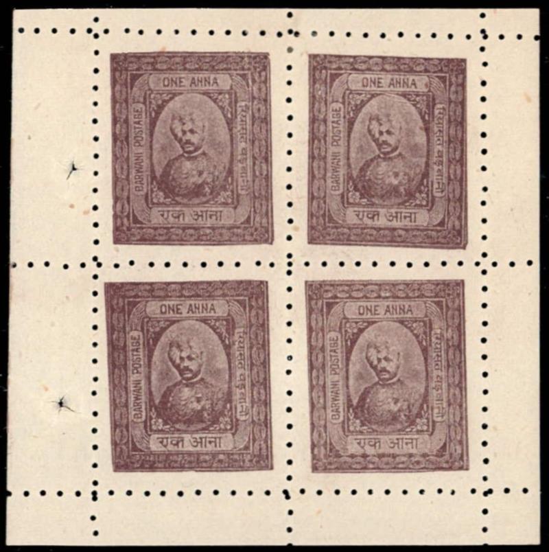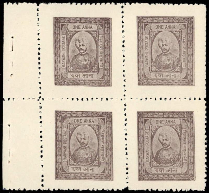 1915-41 ½ a black complete sheet of four overprinted Bundi Service in Devanagri in red with error, overprint omitted on top right stamp. Unused without gum as issued US$0