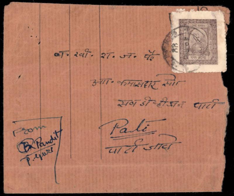 1877 1a pale yellowish brown on local cover tied by Alwar square cancel US$0