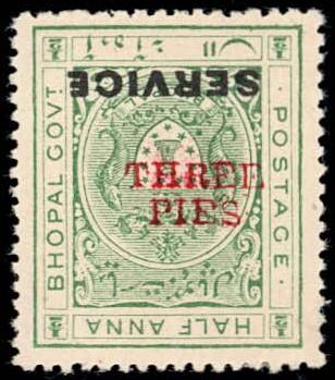 1935-36 ½a yellow-green overprinted SERVICE surcharged THREE PIES in red with error, surcharge inverted. US$0