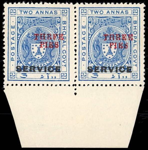 1935-36 2a ultramarine bottom marginal horizontal pair overprinted SERVICE surcharged THREE PIES in red with error, 'THRFE' instead of THREE on left stamp US$0