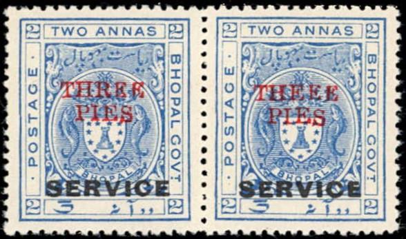 1935-36 2a ultramarine horizontal pair overprinted SERVICE surcharged THREE PIES in red with error, 'THEEE' instead of THREE on right stamp US$0