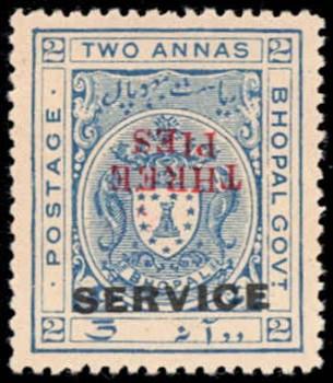 1935-36 2a ultramarine overprinted SERVICE surcharged THREE PIES in red with error, overprint inverted. US$0