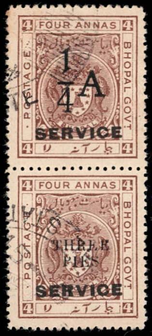 1935-36 4a chocolate vertical se-tenant pair surcharged 1/4 A on top stamp and THREE PIES in black on bottom stamp overprinted SERVICE. US$0