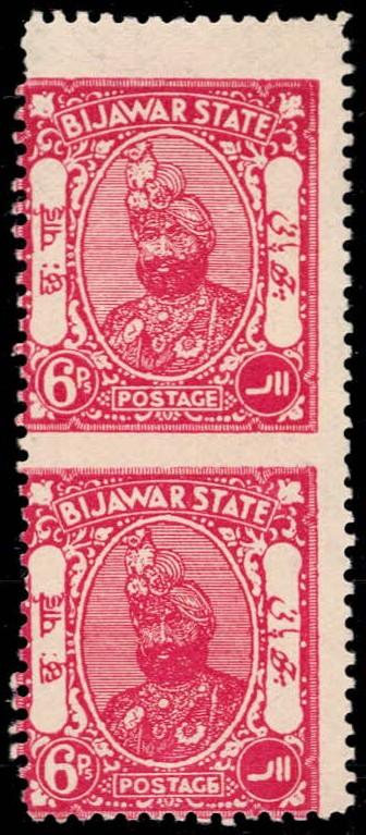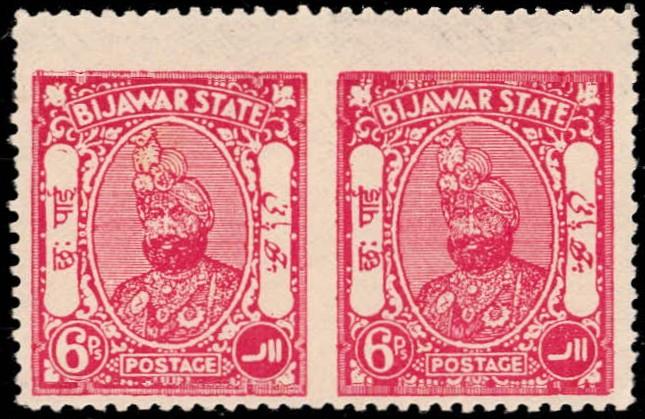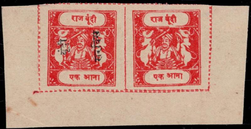 1915-41 1a orange-red bottom marginal pair with error, BUNDI SERVICE handstamped in Devanagri on left stamp, but missing on right stamp. Unused without gum as issued US$0