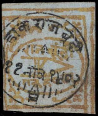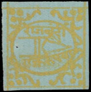 1897 1 rupee yellow on blue laid paper with a tiny pin hole, Unused without gum as issued. 2025 ISES certificate. US$0