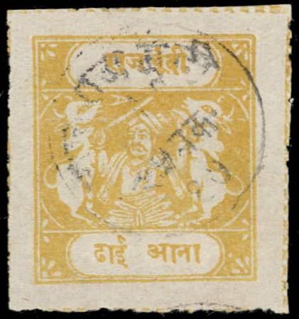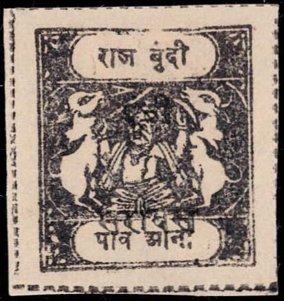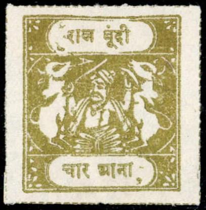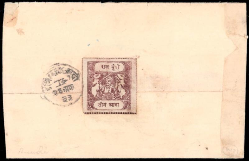 1897-98 1r yellow on blue wove paper with a superb strike of "DAK RAJ BUNDI / 11 NOV 1902" cds US$0