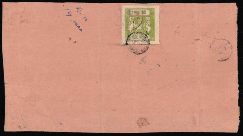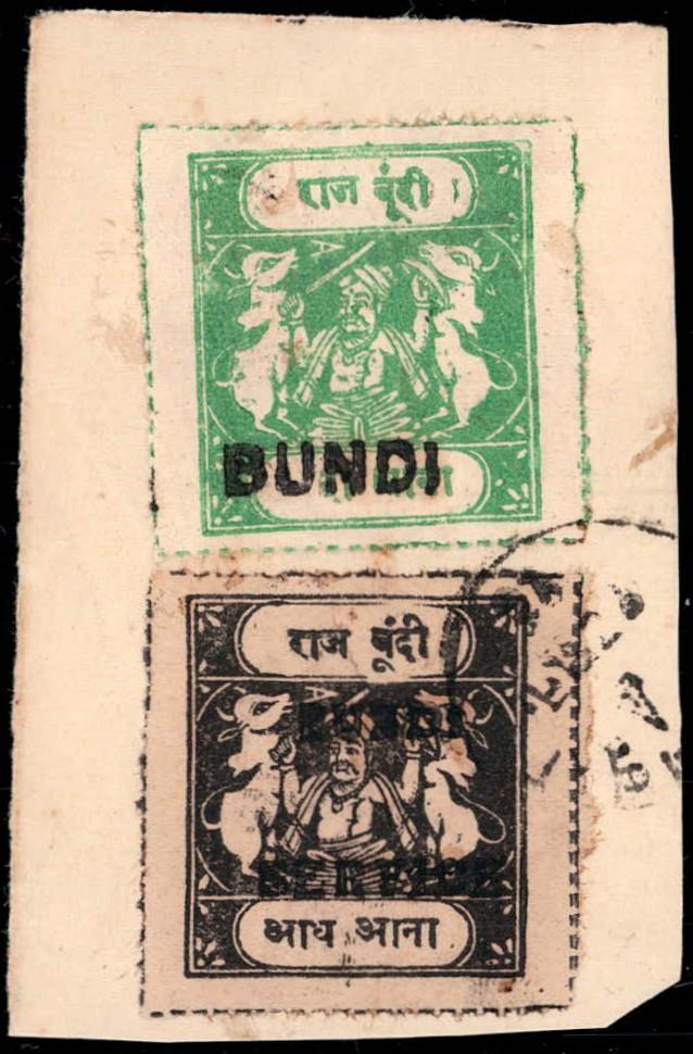 1915-41 ½a black overprinted BUNDI SERVICE in small English letters + 2a sage-green overprinted BUNDI in large English letters used on piece. Used Bundi official stamps are extremely rare and unpriced in SG. Catalog value for 2a unused is £200, used unpriced. 2025 ISES certificate US$0