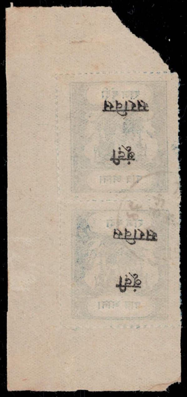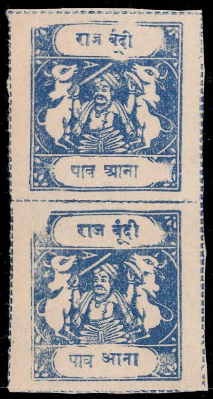 1915-41 ¼a ultramarine vertical pair from the right half of sheet used with error, Bundi Service in Devanagri overprinted on reverse. 2025 ISES certificate US$0