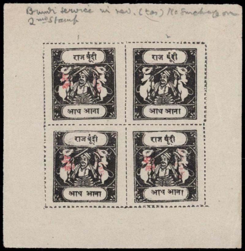 1915-41 ¼a ultramarine block of four overprinted BUNDI SERVICE in large English letters affixed to piece of cover with multiple strikes of the Bundi cds with Dak Raj Bundi / 18 June / 19" delivery cds on reverse. Used Official sacred cows stamps are rare and unpriced in SG. US$0