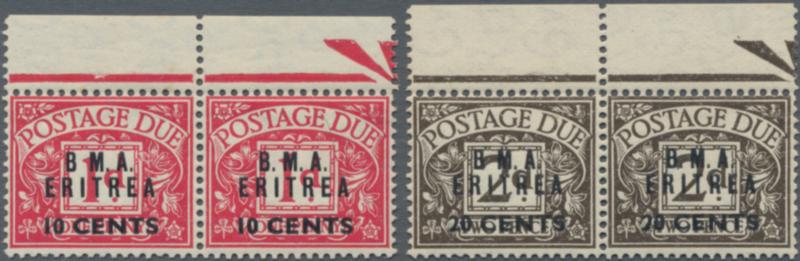 1950, British Occupation of Italian Colonies, British postage due stamps with overprint "B.M.A ERITREA" and new value, 10 cents on 1 d and 20 cents on 2 d, both values in MNH horizontal pairs with upper sheet margin, the left stamp of b