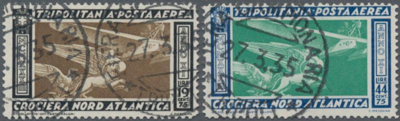 1933 Air 19.75 l. and 44.75 l. both used and cancelled by "FIERA CAMPIONARIA TRIPOLI/27.3.35" c.d.s., with small "CARL H. LANGE" h/s in red on the reverse, fine. (Mi. 600 €) (Ex W. Schneider coll.)