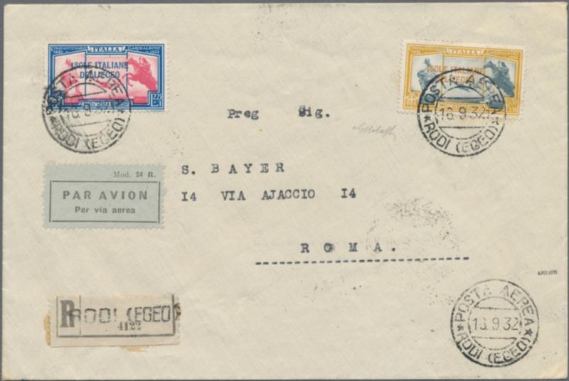 1932, 2.25 L (+ 1) and 4.50 L (+ 1.5) Garibaldi semi postal air mails, tied by "POSTA AEREA * RODI (EGEO) * 16.9.32" to registered airmail cover addressed for Rome. Brindisi transits and illegible Rome arrival on reverse. Signed Bolaffi.