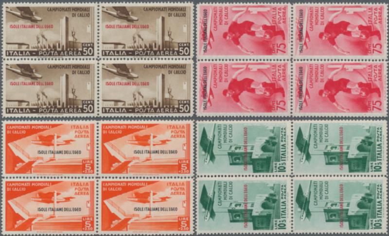 1934, Football World Championship, Airmail stamps 50c.-10l., four values in complete in blocks of four, two stamps previously hinged, others never hinged. Sass. A34/37 (4).
