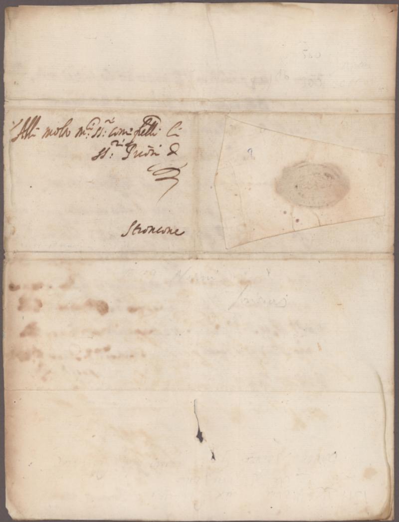 1599, folded letter from NARNI (near Terni, Umbria, Papal State) addressed to the prior of the Stroncone, an abbey south of Terni). Parts of a wax seal covered by paper showing a lion. The very nice watermark shows a bird.(page)