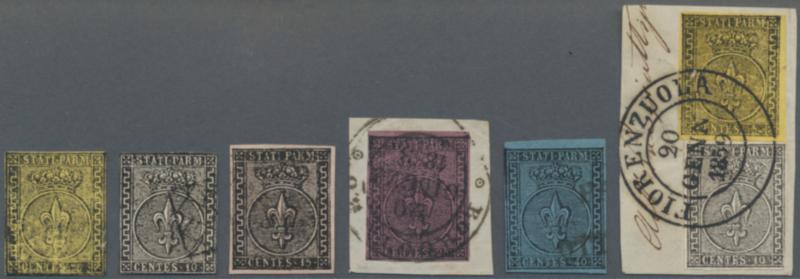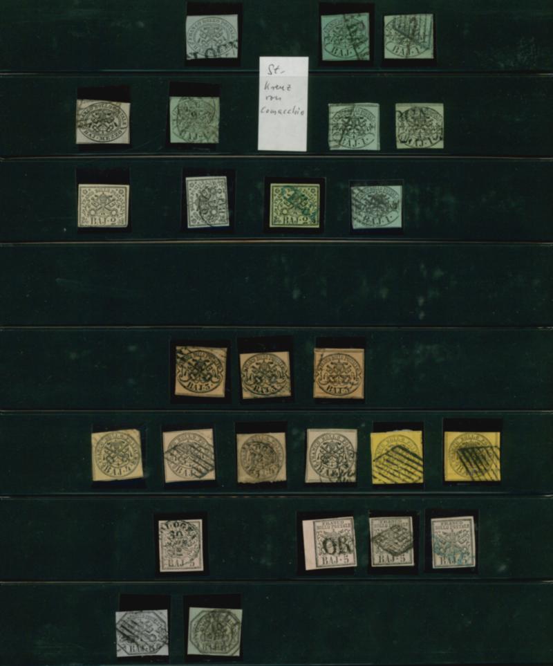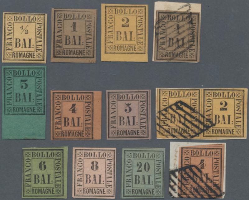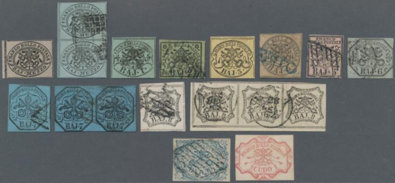 1852, 1 b - 1 Sc, 11 values, mixed quality, the 50 baj. signed, the 1 scudo with certificate (slightly defect). In addition, two pairs and one strip of three.