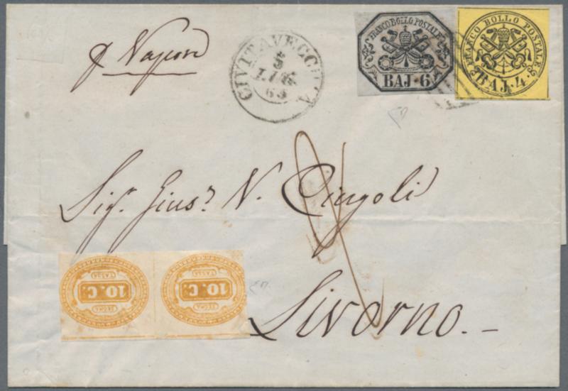 1852, 4 baj yellow and 6 baj greyboth tied by mute Roman grill to ships letter from Civittavecchio to Livorno postes on 5 LULY 1865, m/s "p Vapore" (per steamer) on front. Taxed on arrival and a pair of the Italian 10 c postage due stamp