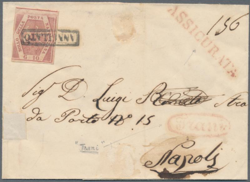 1858, 10 gr rose, plate I, wide margins at three sides, tied by framed "ANNULATO" to registered (Assicuratta = "insured") letter from TRANI to NAPLES. Red "ARRIVO IN NAPOLI 18 MAR 1859" on reverse. Signed Hunkler. In addition two ordinary lett