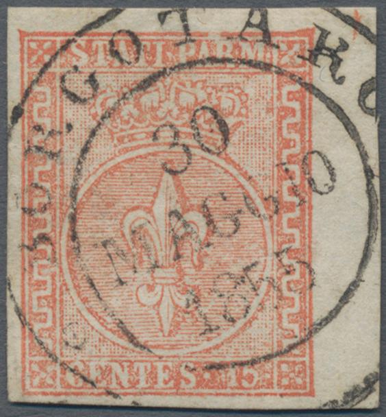 1853, 15 C vermilion from right margin, used with double circle BORGOTARO, 30.MAGGIO 1855. VF/XF condition, signed Oliva.