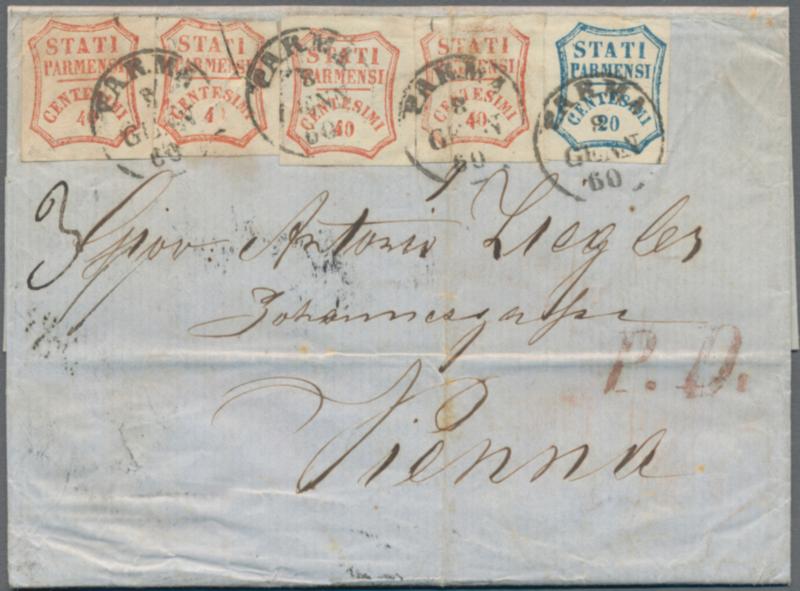 1859, Provisional Government, 20c. blue and four copies 40c. vermillion, 1.80 lire rate on heavy weight lettersheet from "PARMA 8.1.60" to Vienna via "MILANO 9.1.60" and Swiss railway transit "CHUR-ST.GALLEN 10.1.1860", with Vienna arrival mark