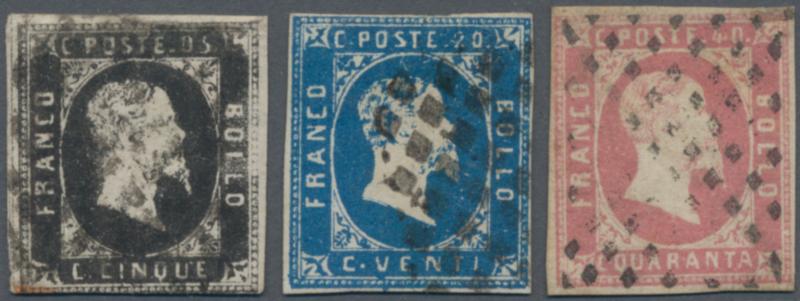 1851/1860, interesting selection of 27 used stamps, comprising many valuable items, i.a. first issue with 1 So yellow on blue (Sass.#2), second issue with 1 Q black (Sass.#10) etc., furthermore 3rd issue in Centesimi currency, i.a. 1 C violet