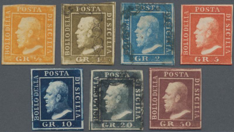 1859, ½ gr - 50 gr, 7 values, 3 values used, others mint, the used 20 gr signed Bourgey, the 5 gr and the 50 gr mint with part of gum are signed Brun. In addition a 2 gr blue tied to cover from PARLEMO for Licata.