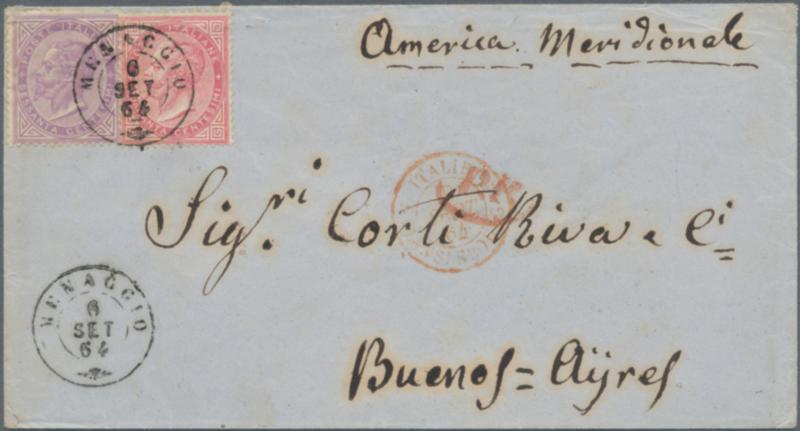 1864, Vittorio Emanuele 40c. carmine and 60c. violet on cover from "MENAGGIO 6.9.64" to Buenos Aires with four Italian/French transit marks on front/on reverse, slight imperfections/postal wear.