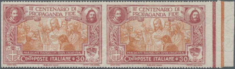 1923, 30 c "Propagada fide", horizontal pair with missing VERTICAL Perforation and sheet margin. Scarce. Sassone 2600 € ++