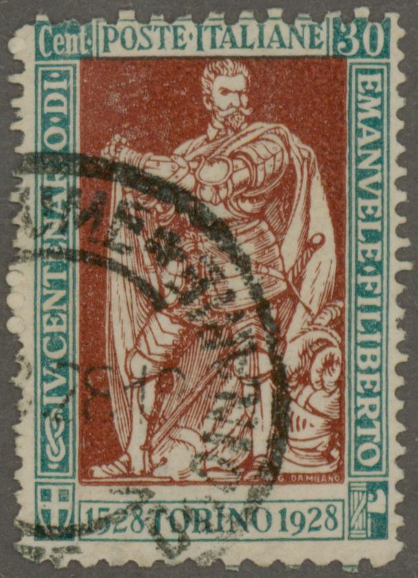 1928, "Emanuelle Filiberti", 30 c green/brown, used with the line perforation 11 x 13¾. Certificate Raybaudi.