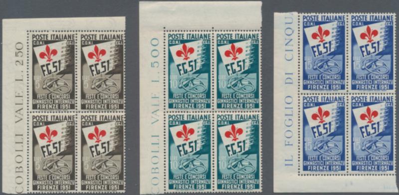 1951, Gymnastics Competition, complete set in corner marginal blocks of four, mint never hinged.