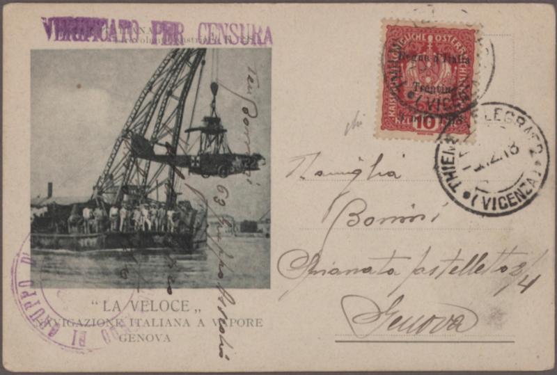 1918, österreichische 10 h mit Überdruck "Regno d'Italia Trentino 3 nov 1918", entwertet "THIENE TELEGRAFO (VICENCA) 5.12.18" adresiert nach Genua, mit Zensurstempeln. Attest Dr. Avi: "Die Verwendung der Trentino-Marken in anderen Gebieten Italiens w